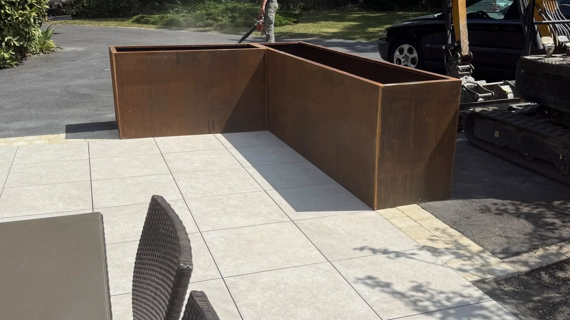 L'un des points forts de cette rénovation réside dans la pose d'une magnifique jardinière corten fabriquée sur mesure. Cet élément architectural, parfaitement intégré à l'ensemble, apporte une dimension végétale et une signature esthétique forte au projet.