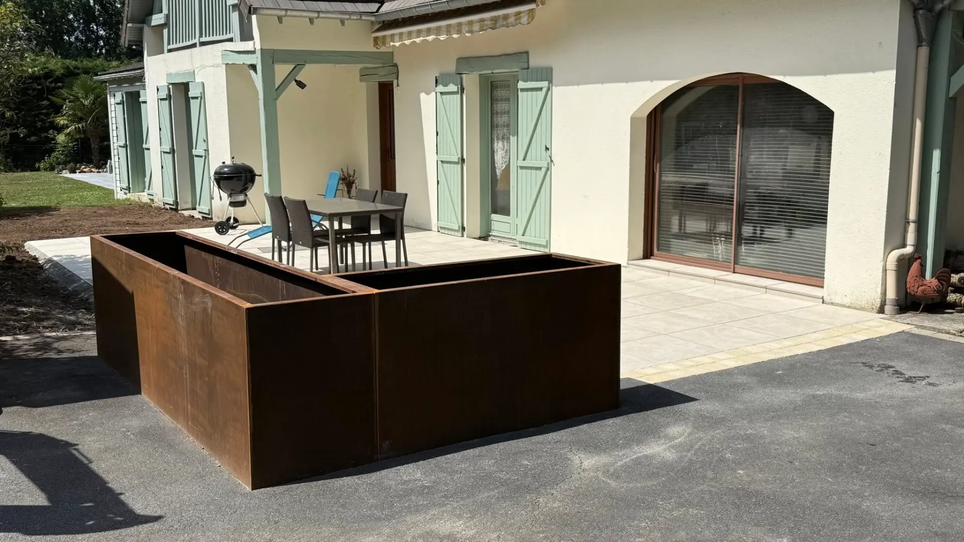 La fabrication sur mesure nous a permis d'adapter parfaitement les dimensions aux contraintes de l'espace, créant un élément à la fois fonctionnel et décoratif. L'acier corten, avec sa patine naturelle caractéristique, s'harmonise parfaitement avec les matériaux environnants.