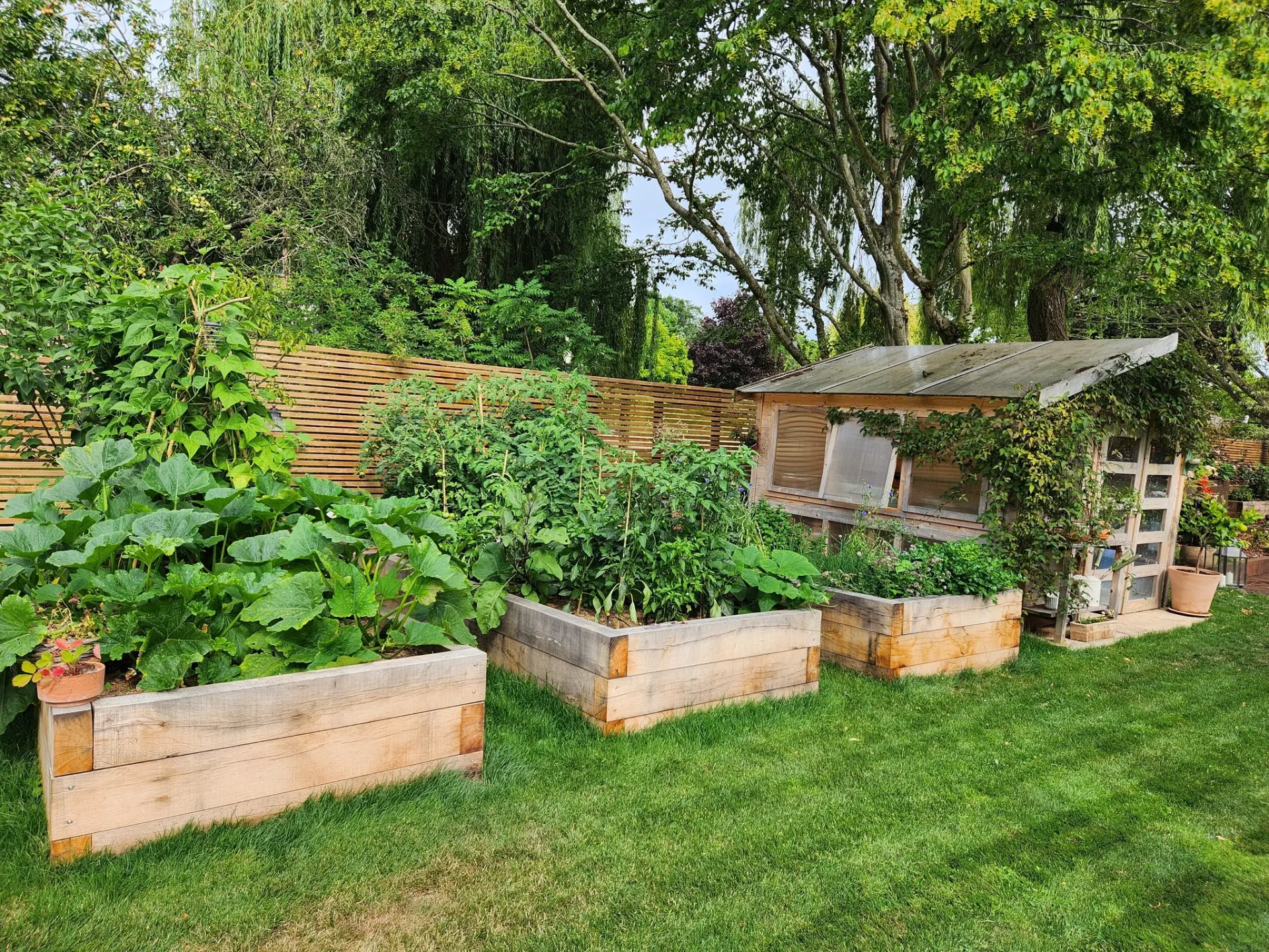 Les jardinières surélevées en bois constituent un autre point fort de ce projet. Conçues sur mesure, elles accueillent un potager généreux où légumes et aromates prospèrent. Cette solution allie fonctionnalité et esthétique, permettant un jardinage confortable tout en structurant harmonieusement l'espace.