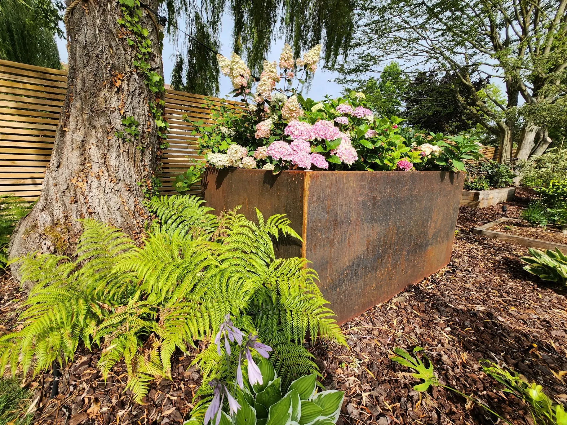 Les jardinières en acier corten apportent une signature contemporaine forte au projet. Leur patine naturelle évolue avec le temps, créant un contraste saisissant avec la végétation luxuriante qu'elles accueillent. Ces éléments architecturaux structurent l'espace tout en offrant des conditions optimales pour le développement des plantations et apportent une harmonie à l'ensemble des massifs que nous avons créés.