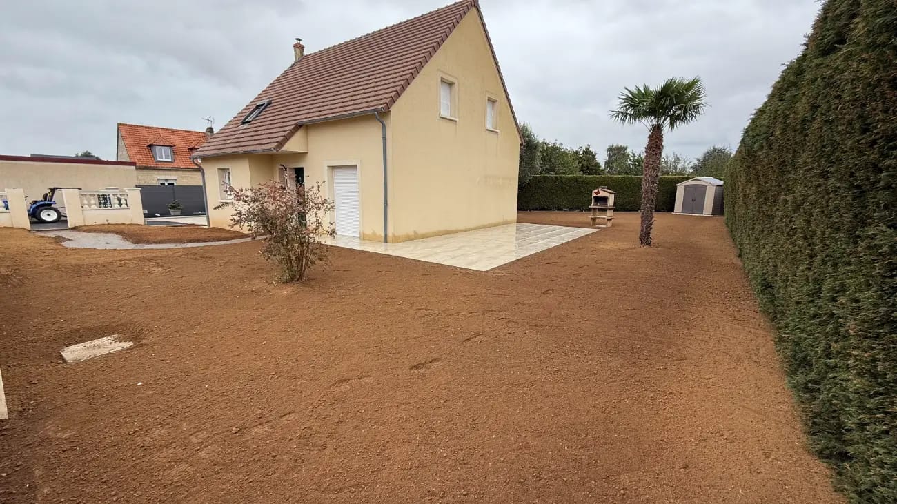 Une terrasse carrelée a été créée le long de la façade arrière, remplaçant une partie de l'ancienne pelouse. Les travaux ont nécessité l'excavation du terrain existant et la préparation d'une fondation adaptée.
