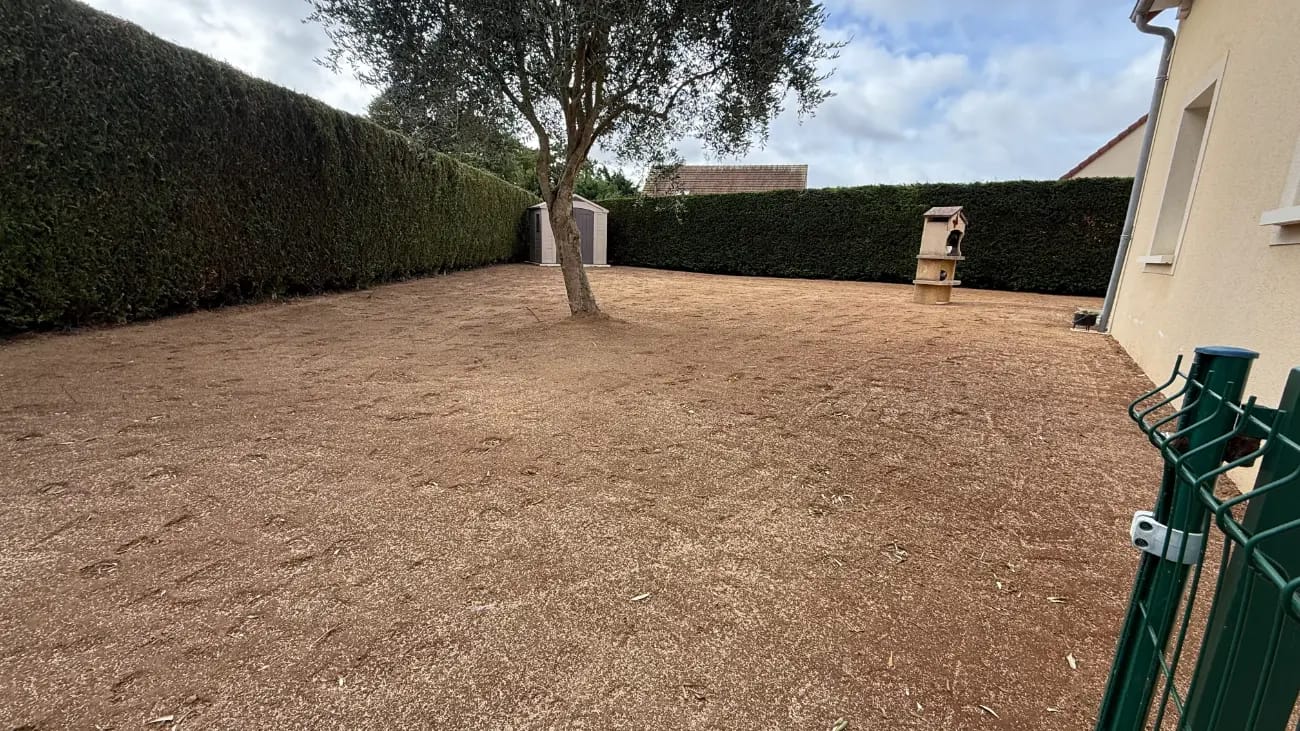 L'ancienne pelouse a été entièrement refaite. Le terrain a été décompacté, amendé et nivelé avant la nouvelle installation. Cette étape était nécessaire pour intégrer harmonieusement les nouveaux aménagements.